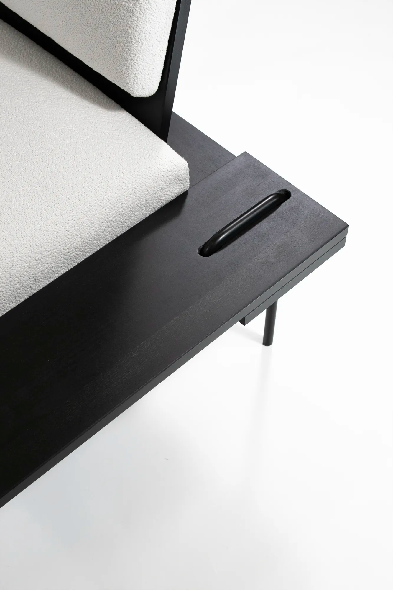 Das charakteristische Design dieser Kollektion wird durch die erhabene „geschneiderte Naht“ aus elegant gebogenem Metall geprägt. Schwarz gepulverte Metallbeine ruhen in zentrierten Fassungen dunkel gebeizter Holzoberflächen und verleihen Graphite eine harmonische Balance aus Präzision und Sinnlichkeit. Die breiten Seitenteile des Lounge Chairs umrahmen das bequeme Sitzpolster und bieten zugleich großzügige Ablageflächen.